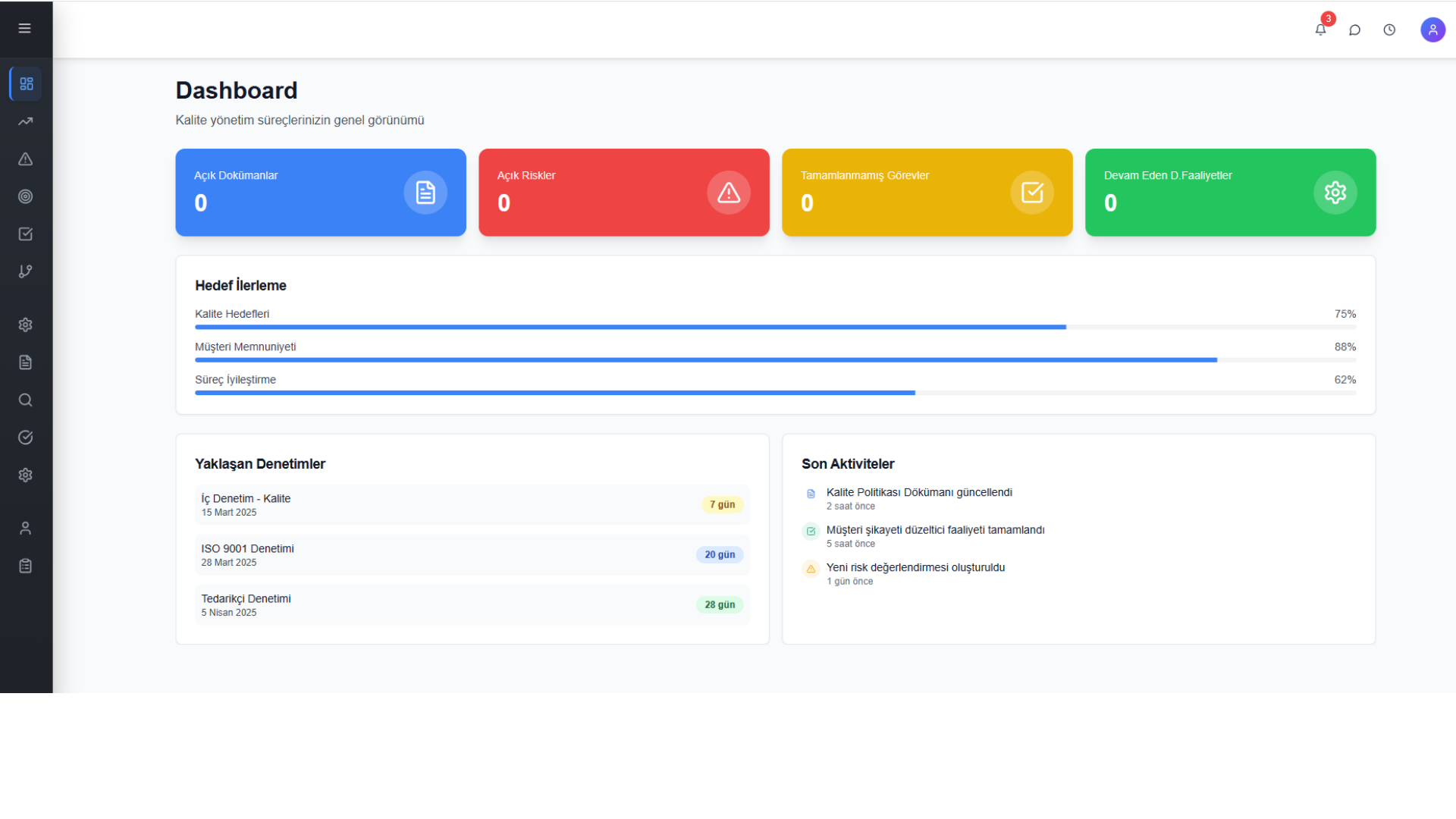 Prolist QM, kurumların kalite yönetim süreçlerini dijital, bütüncül ve sistematik bir yapı altında yönetmesini sağlayan akıllı kalite yönetim yazılımıdır. Kalite yönetimini yalnızca dokümantasyon olarak değil; risk, hedef, süreç, performans ve sürekli iyileştirme odaklı bir yönetim modeli olarak ele alır.